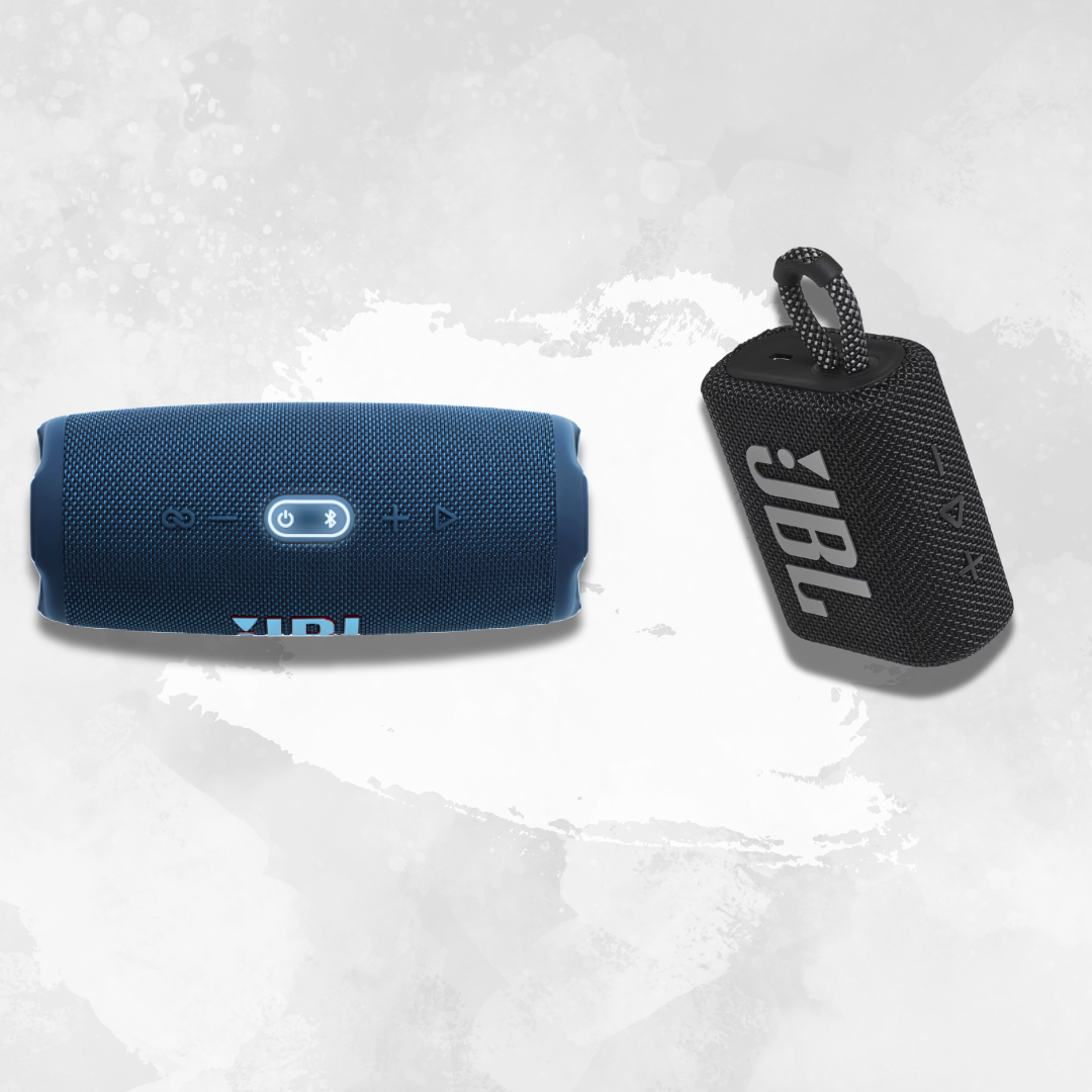 Disfruta de la portabilidad del JBL Go 3, ideal para llevar a cualquier parte, y experimenta la potencia del JBL Charge 5, diseñado para ofrecer un sonido espectacular y resistente en cualquier ambiente.